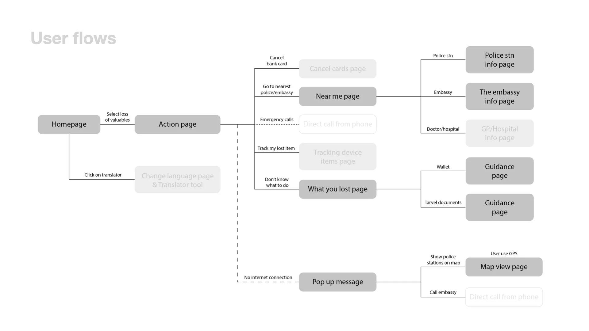 Since the steps for losing wallet and losing travel documents are very similar; I could combine them into one guidance page with a clear indication on which steps to skip, reducing extra clicks.Homepage